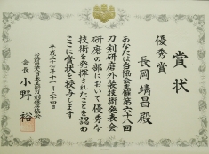 第六十八回刀剣研磨・外装技術発表会、研磨の部/鎬造部門において「優秀賞一席」(総合4位)を受賞しました。